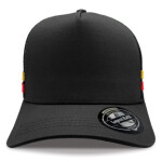 Premium Cotton Twill - Front panel and peak, Polyester mesh - Side and rear panels. Structured 5 panel design with deep Crown, 2 coloured stripes on side panels, Colour-matched tape over inside seams. Curved peak with 4 rows of stitching. Button colour-matched to front panel. Adjustable plastic tab fastener.
